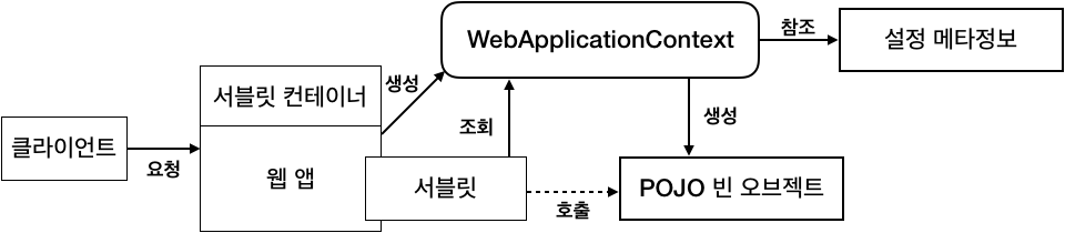 스프링에서는 DispatchServlet이 애플리케이션 컨텍스트를 생성하고 설정 메타정보로 초기화해주고, 클라이언트로 들어오는 요청마다 적절한 빈을 찾아서 실행해준다.